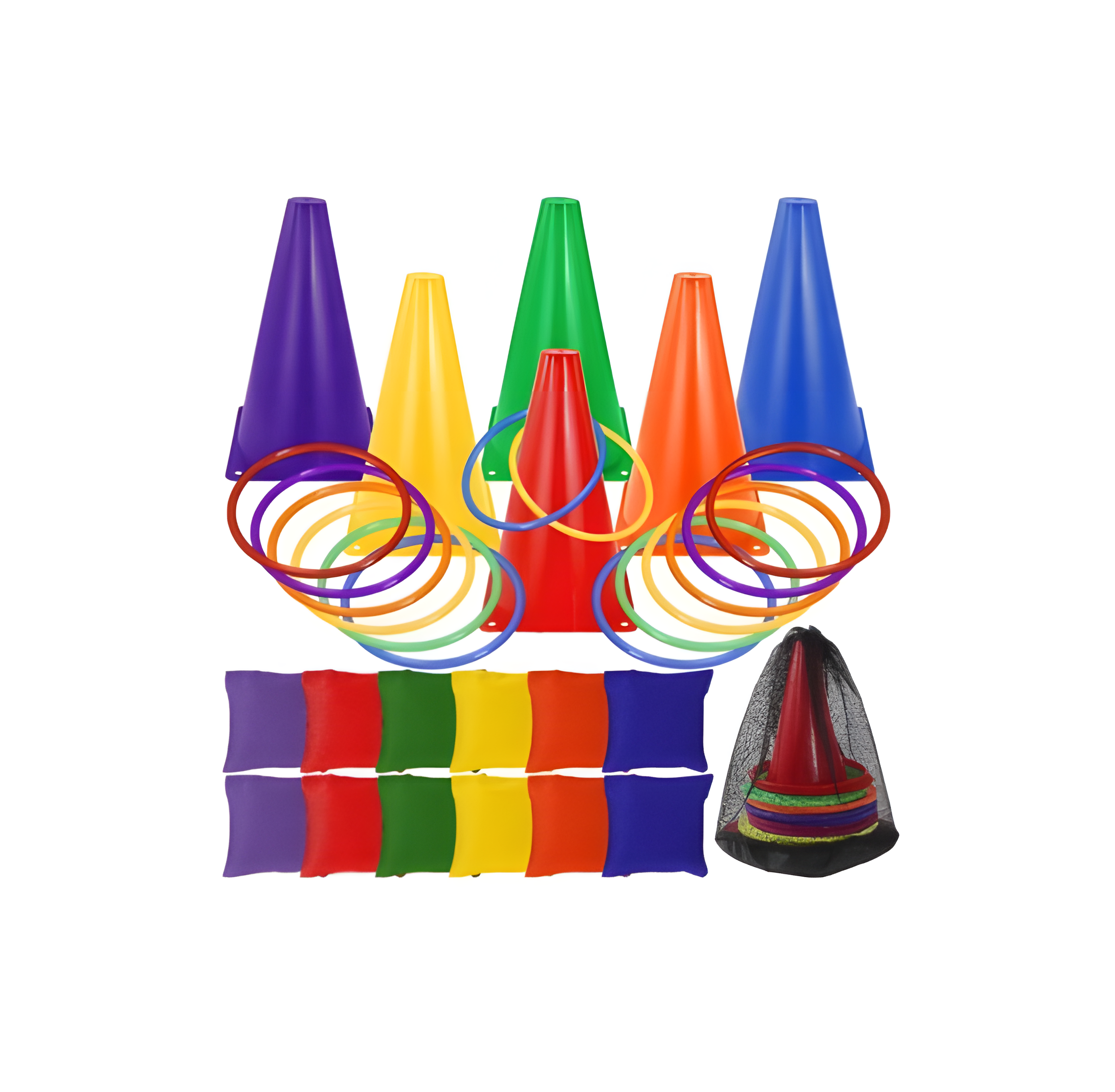 Kužeľe sú vyrobené z odolného plastu, vrecúška z mäkkej polyesterovej látky a kruhy sú ľahké a príjemné na manipuláciu. Všetky prvky sú navrhnuté tak, aby boli bezpečné aj pre osoby so zníženou silou či obmedzenou pohyblivosťou.